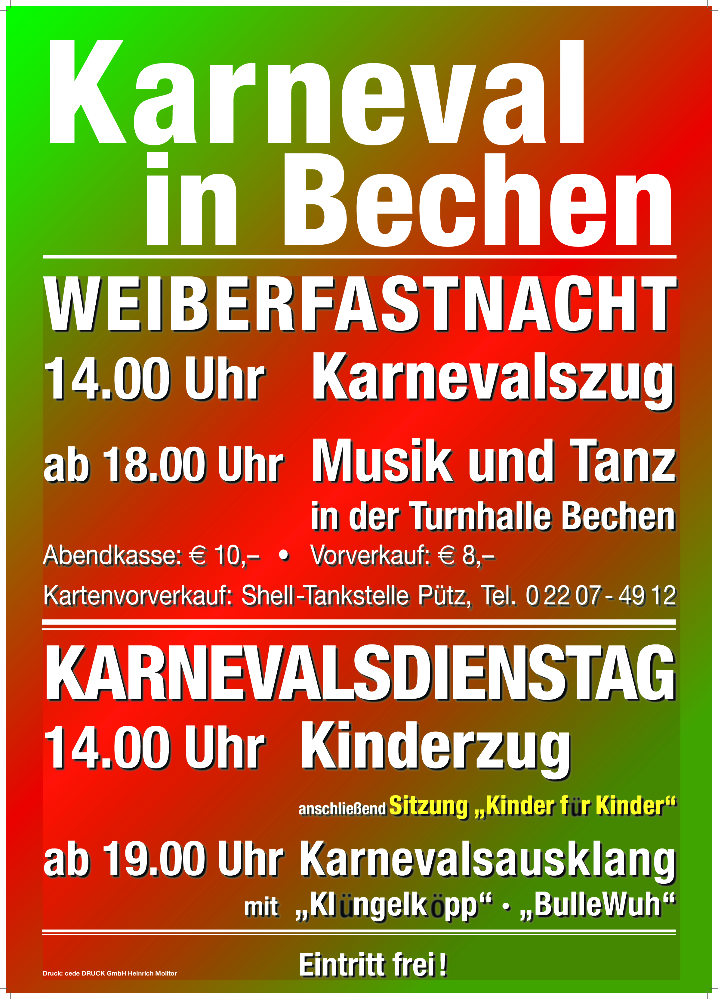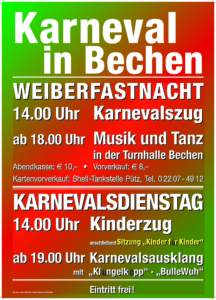 Feiert mit uns, „BulleWuh“ und den „Klüngelköpp“ bei freiem Eintritt in der Bechener Turnhalle.