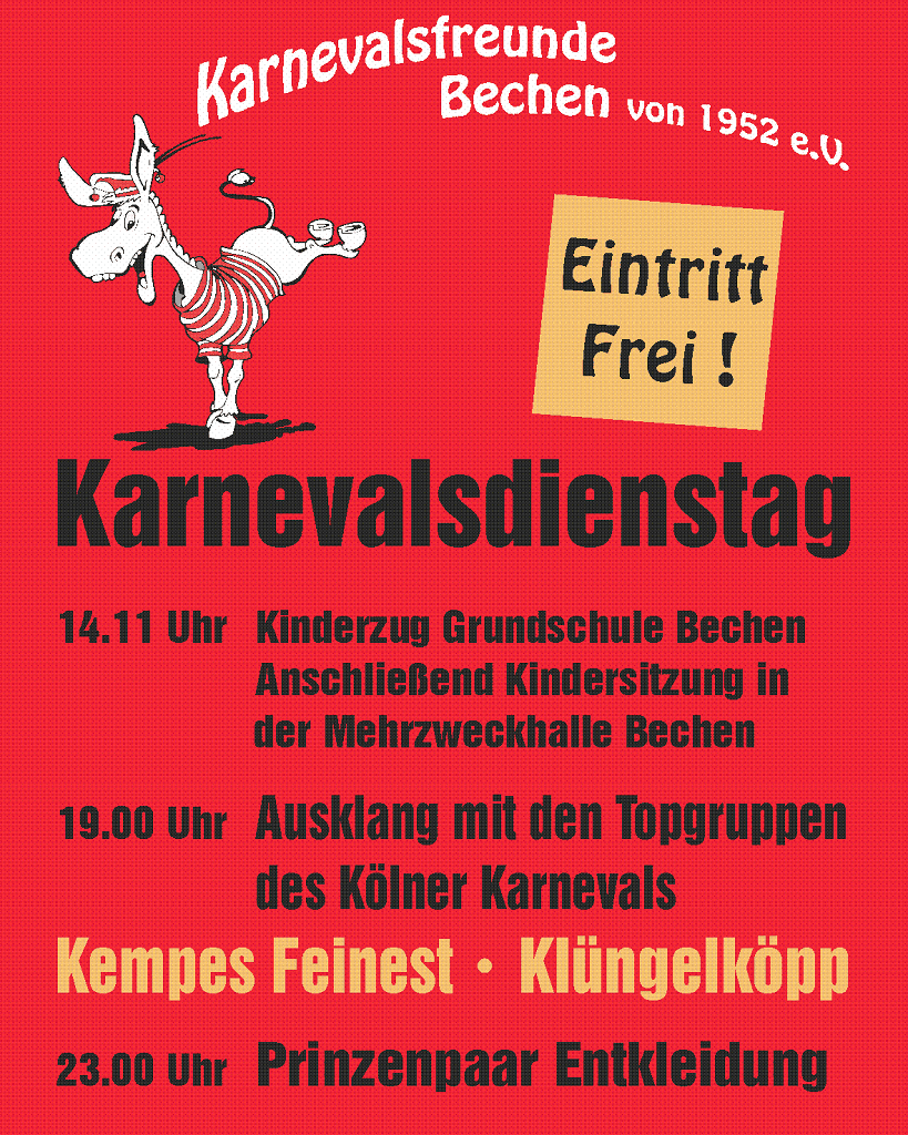 Im Anschluss treffen sich die jungen Jecken in der Bechener Turnhalle. Bei einem bunten Programm können unsere Gäste die Kindersitzung genießen. Unter anderem mit Auftritten der Rot-Weißen Eselchen und verschiedenen Gruppen der Grundschule (Dreigestirn, Stepptanz, OGS…).