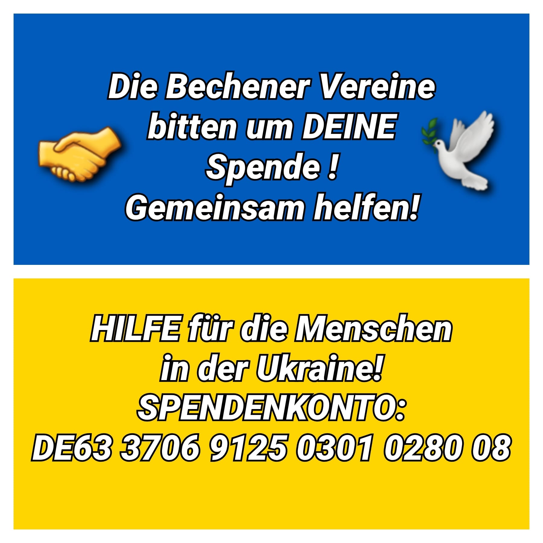 die erste Spendensammelaktion der Bechener Vereine (Karnevalsfreunde Bechen, Musikgemeinschaft Bechen und Sportverein Bechen) ist bereits, dank sehr vieler Unterstützer im vollen Gange. Bereits am morgigen Dienstag, den 08.03.2022 werden alle Spenden auf dem Weg zu den notleidenden Menschen in den Kriegsgebieten sein. Für uns als Vereine ist es völlig klar: Wir wollen weiter helfen!